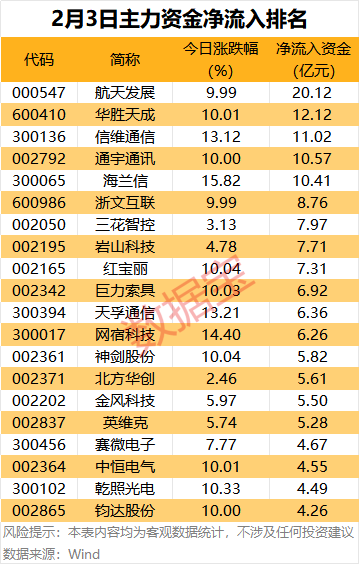 从个股看,50股获主力资金净流入超2亿元,航天发展、华胜天成、信维通信、通宇通讯、海兰信5股获主力资金净流入超10亿元。
