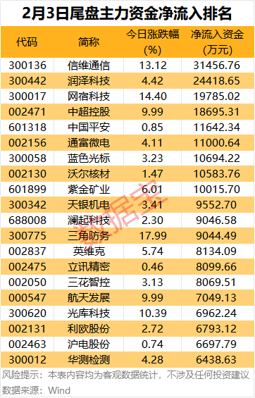 个股方面,9股尾盘获主力资金净流入超亿元,其中信维通信、润泽科技尾盘净流入均超2亿元,网宿科技、中超控股、中国平安等净流入均超1亿元。