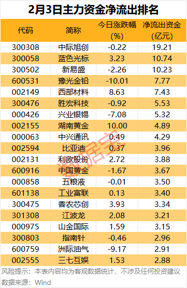 尾盘主力资金净流出方面,豫光金铅、中际旭创、洲际油气、盛达资源净流出居前,金额分别为5.83亿元、3.74亿元、1.83亿元、1.2亿元。