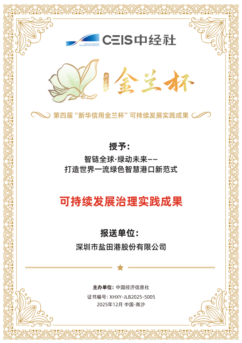近日,第四届“新华信用金兰杯”可持续发展实践成果名单正式公布。盐田港股份公司凭借“智链全球·绿动未来——打造世界一流绿色智慧港口新范式”实践成果成功入选,其可持续发展治理体系与长效机制建设成果获广泛认可。