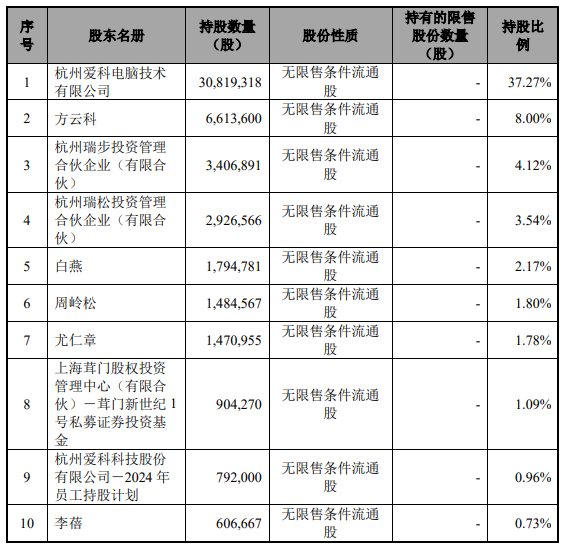 发行人的控股股东为爱科电脑,截至2025年9月30日,发行人实际控制人为方小卫及配偶徐帷红、儿子方云科。方小卫与徐帷红通过爱科电脑间接持有公司合计37.27%的股份,方云科直接持有公司8%的股份,同时,方云科作为瑞步投资和瑞松投资的执行事务合伙人可以控制瑞步投资和瑞松投资分别持有的4.12%和3.54%爱科科技股份的表决权,方云科能够控制爱科科技合计15.66%股份的表决权。方小卫及配偶徐帷红、儿子方云科合计能够控制爱科科技52.93%股份的表决权,为公司的实际控制人。