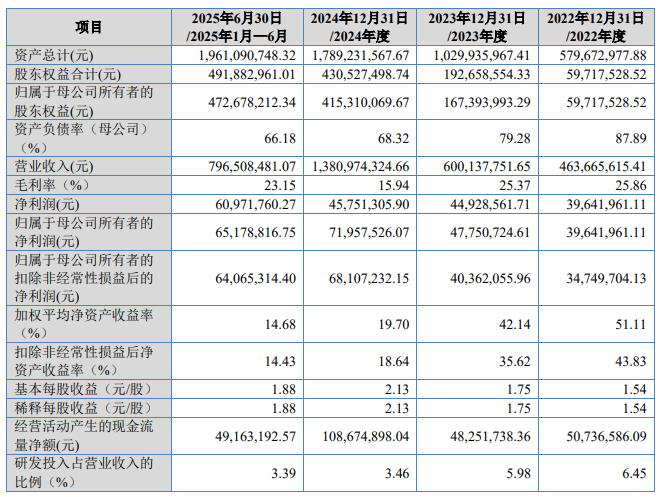报告期内,公司营业收入分别为4.64亿元、6.00亿元、13.81亿元和7.97亿元;同期实现扣非归母净利润分别为3474.97万元、4036.21万元、6810.72万元和6406.53万元。