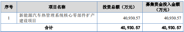 此次IPO拟募集4.09亿元,用于新能源汽车热管理系统核心零部件扩产建设项目。