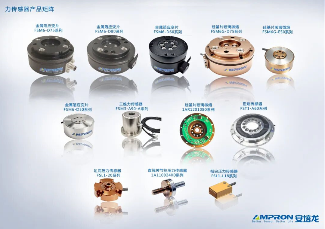 力传感器系列包括六维力传感器和扭矩传感器等。六维力传感器可同时测量三个方向力与三个方向力矩,内部集成多组敏感元件,实时采集直线受力与扭转受力状态。安培龙力传感器拥有金属箔应变片与MEMS硅基应变片两种技术路线,具有优秀的零点温漂稳定性和抗冲击能力。