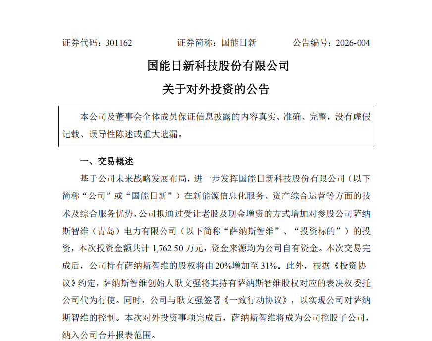 2月2日,国能日新科技股份有限公司(简称“国能日新”)发布公告,宣布拟以1762.50万元增资参股公司萨纳斯智维(青岛)电力有限公司(以下简称“萨纳斯智维”)。交易完成后,国能日新对萨纳斯智维的股权将由20%增至31%。