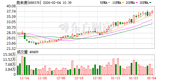 奥来德股价再创历史新高,该股近期呈不断突破新高之势,近一个月累计有11个交易日股价刷新历史纪录。截至10:06,该股目前上涨3.01%,股价报38.31元,成交377.02万股,成交金额1.43亿元,换手率1.56%,该股最新A股总市值达95.50亿元,该股A股流通市值92.31亿元。