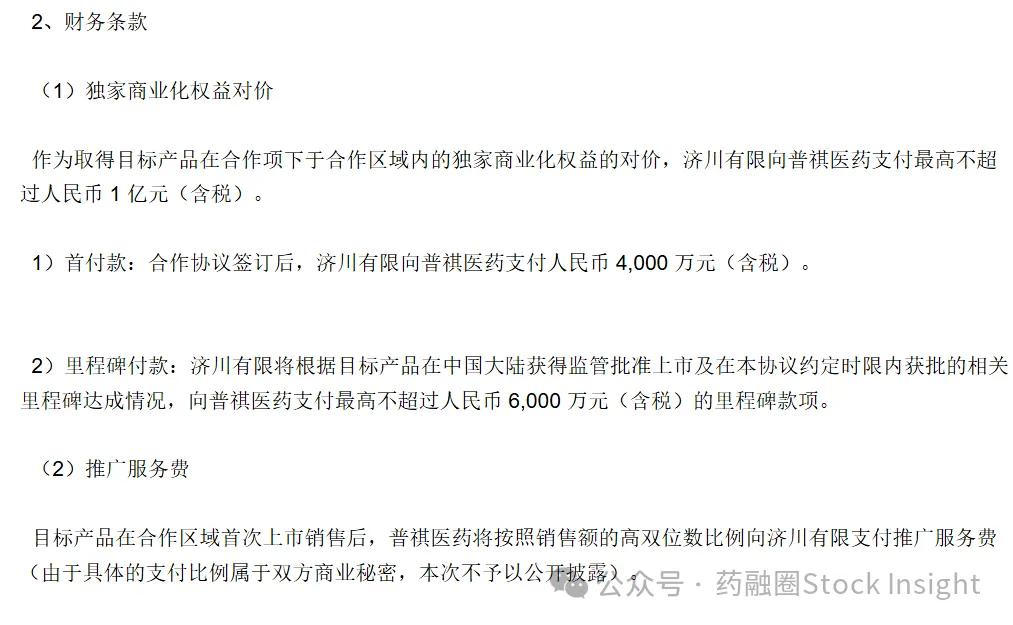 根据协议条款,普祺医药将获得最高1亿元人民币的首付款和研发里程碑款,济川药业将获得该产品在大中华区(含大陆、香港、澳门和台湾地区)的独家商业化权益。
