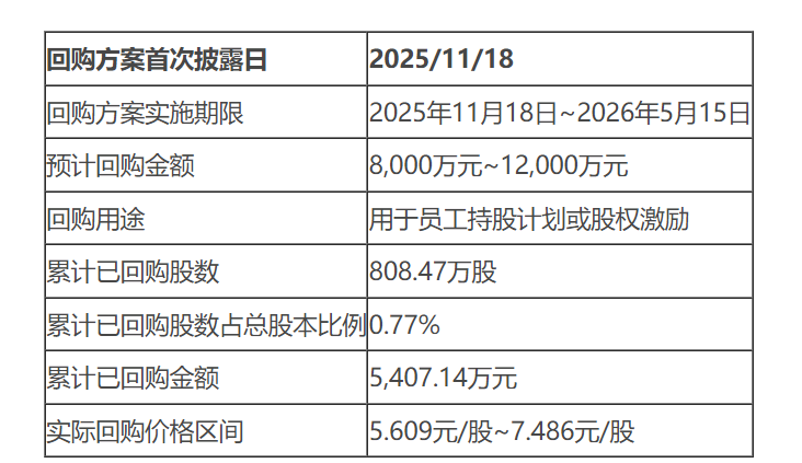 -最新进展:累计回购808.47万股(占总股本0.77%),支付5407.14万元,完成计划下限67.6%;2026年1月新增回购121万股,金额786.43万元,成交区间6.423–6.570元/股,均低于价格上限。