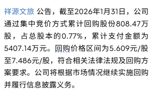 2026年2月3日,浙江祥源文旅股份有限公司(以下简称“祥源文旅”)发布股份回购进展公告,披露截至2026年1月31日的回购实施情况。公告显示,公司已累计回购股份808.47万股,占总股本的0.77%,累计支付金额5407.14万元,已完成回购计划下限的67.6%。