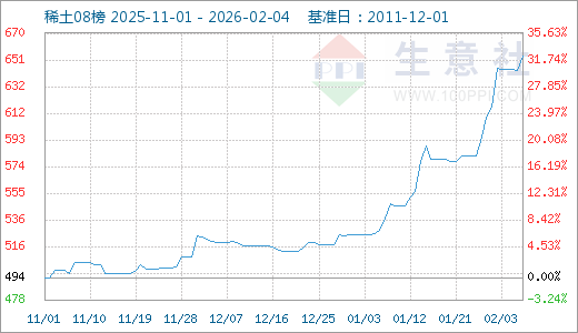 据生意社商品行情分析系统,近期国内轻稀土市场价格持续上涨,2月3日生意社稀土指数为654点,较昨日上升了11点,较周期内最高点1007点(2022-02-24)下降了35.05%,较2015年09月13日最低点271点上涨了141.33%。(注:周期指2011-12-01至今)