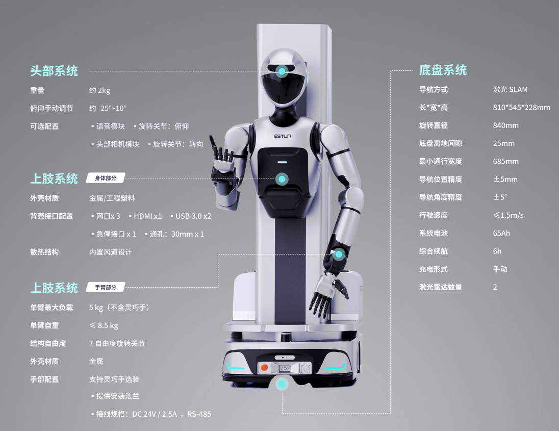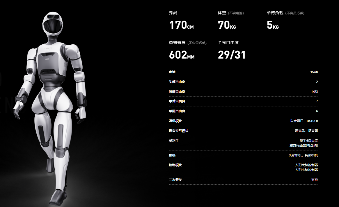 启蒙C05-U为半身人形机器人,双臂采用全金属结构,单臂具备7个旋转自由度,标配小脑运动控制器,可选配智能化大脑的同时,可选配头部相机、语音模块,增强人机交互体验。公司自研模块化上肢系统,支持快速组装与维护。该款机器人适用于教育科研、商业服务、产线协作等多种场景。