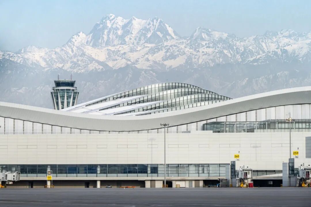 乌鲁木齐国际机场是“一带一路”建设中的关键交通枢纽,也是我国连接欧洲、亚洲、辐射中亚与西亚地区的重要国际航空门户。本期改扩建工程新建航站楼面积约50万平方米,旨在实现2025年旅客吞吐量3500万人次的目标。航站楼建筑高度55米,采用三指廊构型,主楼部分一次性建成,指廊则分期实施,兼顾近期运营需求与远期发展空间,有效平衡了建设效益与经济性。陆侧交通采用双向进场方式,道路系统结合场地高差进行设计,构建起高效灵活的地面交通体系。建筑以"丝路天山"为设计理念,实现室内外空间的一体化营造。屋面形态延续"天山"脉络,天窗设计融入"丝路"意象,整体造型流畅而富有象征意义。航站楼内部规划国际与国内文化双轴线布局,生动诠释人文机场内涵,充分发挥枢纽机场作为文化传播窗口的作用。