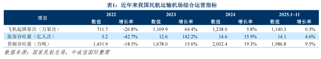 机场系航空运输体系的重要组成部分,其行业表现与国民经济发展高度关联。2025年以来,我国航空运输市场展现出稳步增长的韧性与发展潜力,1~11月民航机场旅客吞吐量、货邮吞吐量及飞机起降架次保持增长态势但增速有所放缓。