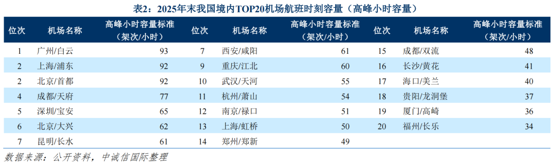 2025年以来机场项目集中投运,基础设施保障能力显著提升,但部分时刻容量获批提升的机场尚未实际放量;随着存量机场建设项目加速推进,军民共用空域协调机制优化提高空域资源配置效率,预计2026年机场产能上限将进一步提升。