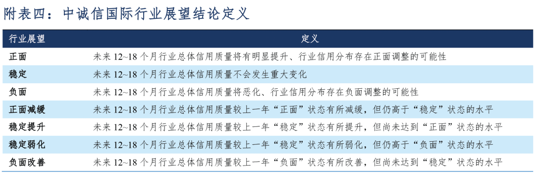 中诚信国际认为,未来12~18个月该行业总体信用质量不会发生重大变化。