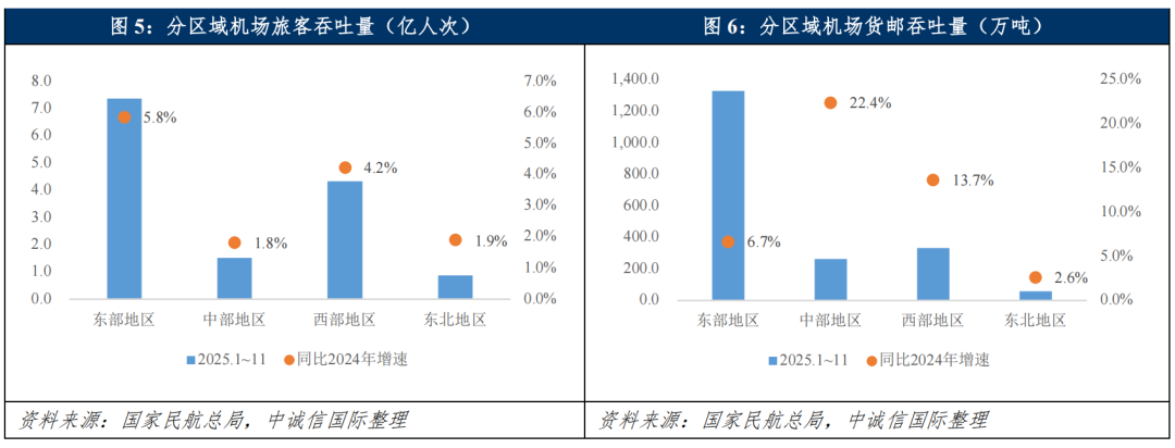 分区域来看,我国不同地区机场数量、运输保障能力及腹地经济等方面存在较大差异。东部地区机场受益于腹地经济实力强、人口密度高及国际航空枢纽占比高,客货吞吐量均处于绝对领先的地位。其中,随着国际客运量快速恢复,该地区旅客吞吐量同比增长5.8%,增速高于全国平均水平且市场份额有所回升;货邮吞吐量同比亦呈增长态势,但货运市场份额在鄂州花湖机场全球航线布局优化、转运中心产能持续释放下有所下滑而中部地区货运市场份额提升;预计未来区域经济协同发展、国际航空枢纽功能体系建设及海南省全面封关等利好政策将为东部地区客货吞吐量持续增长注入潜力。中部地区是受高铁分流影响最大的区域,且无国际航空枢纽,客运增速低且市场份额呈下降趋势,但如前所述,其2025年以来货邮市场竞争力进一步增强。受益于“一带一路”、“西部大开发”等国家战略,成都、重庆、西安和乌鲁木齐等地区成为丝绸之路经济带的开放前沿,高端制造业集聚、跨境电商发展使西部地区客货吞吐量均保持较高增速,市场份额较为稳定。东北地区经济发展相对落后,航空运输需求相对较少,客货市场份额均低于其他区域。