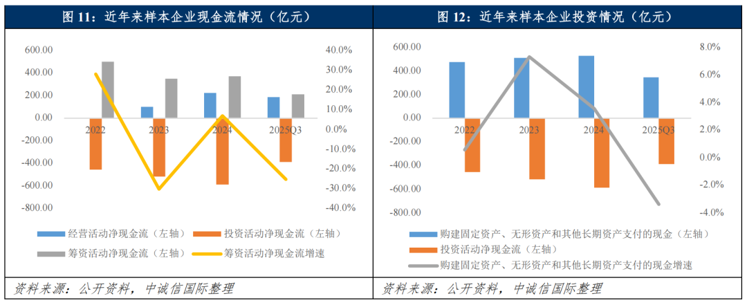 现金流方面,机场业务量平稳向好发展带动样本企业经营活动净现金流持续上升,2025年前三季度同比增长13.4%至188.19亿元。其中,海南机场支付在建地产项目工程款和储备土地尾款,当期经营活动净现金流仍为负值但流出规模收窄,东部机场集团受运营支出增加、山东机场集团受营收规模下降影响,经营活动净现金流亦呈净流出态势,其余样本企业均为净流入。机场建设项目按照适度超前原则匹配市场需求,机场吞吐量增速放缓使部分企业项目建设周期拉长,叠加部分项目审批时投资规模有所压降,2024年15家样本企业购建固定资产等长期资产支付的现金增速较上年同期下降3.7个百分点至3.6%,2025年前三季度增速转为负值,同比下降3.4%至346.55亿元。样本企业筹资活动现金流与机场建设进度相匹配,2024年以来仍保持较大规模的净流入但增速波动下降。