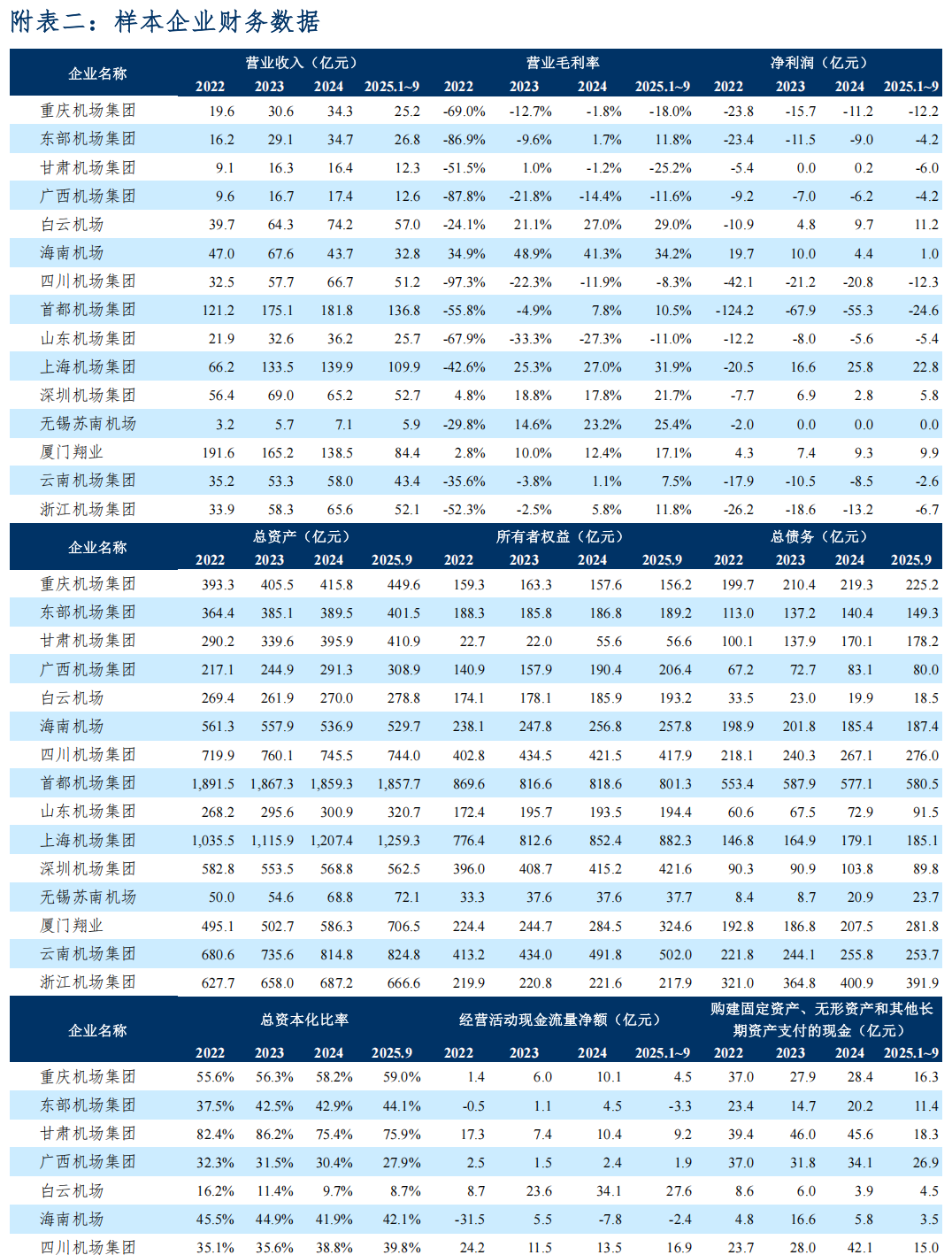 ● 2025年以来,机场业务量持续增长进一步改善样本企业经营业绩及获现能力,同时项目建设周期拉长、宽松的资本市场环境、持续获得政府及民航局的资金支持有效缓解了企业项目建设压力,财务杠杆虽小幅增长但仍合理,偿债能力亦处于较好水平。