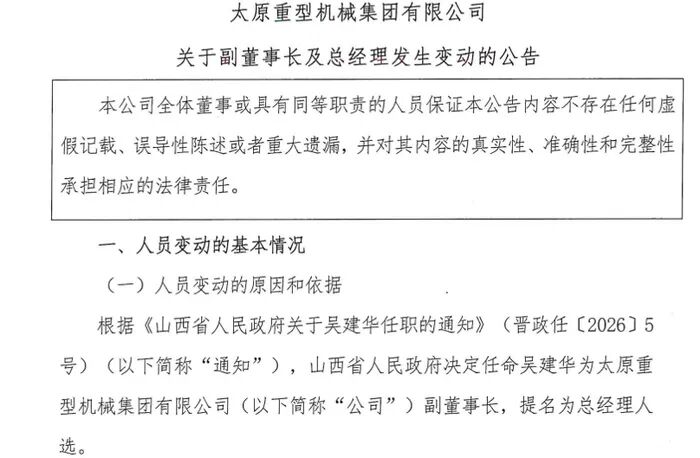 2月2日,太原重型机械集团有限公司正式公告,任命吴建华为集团副董事长,并提名其为总经理人选。此前一个月,陶家晋已履新集团党委书记、董事长。至此,太重集团一二把手全部到位,形成“资深管理者+技术专家”的双核驱动格局。