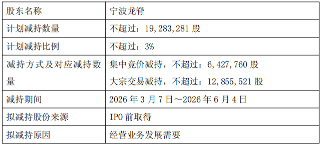 公司于2026年2月3日收到股东宁波龙脊《股份减持计划告知函》。因经营业务发展需要,宁波龙脊拟通过集中竞价及大宗交易方式减持股份不超过19,283,281股。其中,通过集中竞价方式进行减持的,任何连续90个自然日内减持的股份总数不超过6,427,760股;通过大宗交易方式进行减持的,任意连续90个自然日内减持的股份总数不超过12,855,521股。