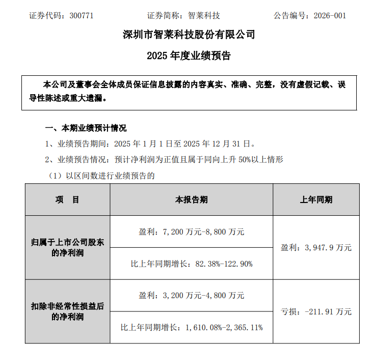 智莱科技发布业绩预告,预计2025年度净利润为7200万元-8800万元,同比增长82.38%-122.90%。