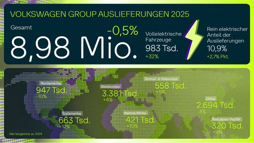 与丰田汽车集团对应的是,德国大众汽车集团已经连续六年排名第二,2025年全球销量为898.4万辆,同比下滑0.5%。作为集团销量主力的大众乘用车品牌全年交付473.1万辆,同比下滑1.4%。此外,斯柯达同比增长12.7%至104.4万辆,奥迪同比下滑2.9%至162.36万辆,保时捷同比下滑10.1%至27.94万辆。