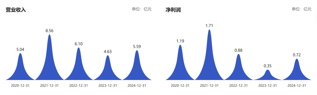 从业绩表现来看,洁特生物近年来的经营业绩呈现明显波动态势。2020年-2024 年,其营收分别为5.04亿元、8.56亿元、6.10亿元、4.63亿元、5.59亿元,营收规模在2021年触达阶段性高点后持续回落,直至2024年才略有回升。同期净利润也随之起伏,分别为1.19亿元、1.71亿元、0.88亿元、0.35亿元、0.72亿元。