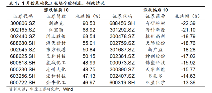 2026年1月,基础化工板块529只个股中,共有424支股票上涨,104支下跌。其中斯迪克、红宝丽、闰土股份、海优新材和东方铁塔位居涨幅榜前五,涨幅分别为90.53%、68.92%、68.54%、55.01%和50.84%;有研粉材、海科新源、杭州高新、天际股份和新广益跌幅居前,分别下跌22.39%、21.10%、18.79%、18.76%和18.28%。
