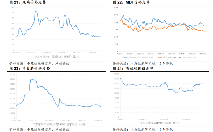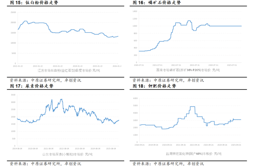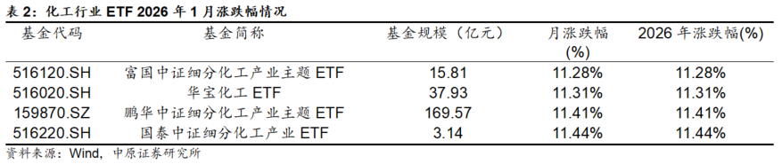 市场回顾:根据Wind数据,2026年1月中信基础化工行业指数上涨10.13%,跑赢上证综指6.37个百分点,跑赢沪深 300 指数8.48个百分点,行业整体表现在30个中信一级行业中排名第6位。近一年来,中信基础化工指数上涨56.36%,跑赢上证综指29.68个百分点,跑赢沪深 300 指数33.06个百分点,表现在30个中信一级行业中排名第4位。