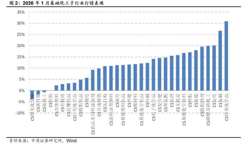 根据Wind数据,2026年1月,33个中信三级子行业中,30个子行业上涨,3个子行业下跌。其中印染化学品、氯碱、氨纶行业表现居前,分别上涨30.94%、26.69%和20.16%,锂电化学品、碳纤维、氟化工行业表现居后,分别下跌3.91%、1.71%和0.74%。