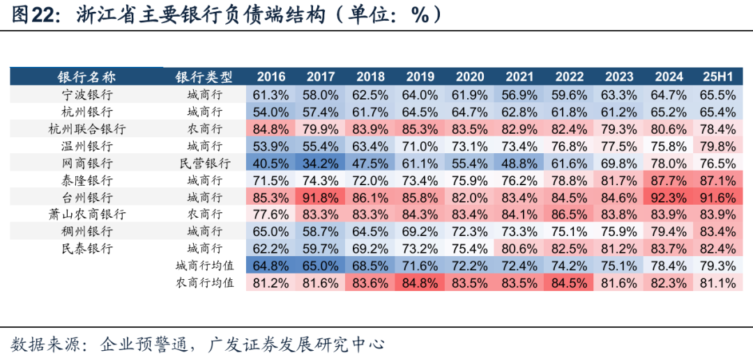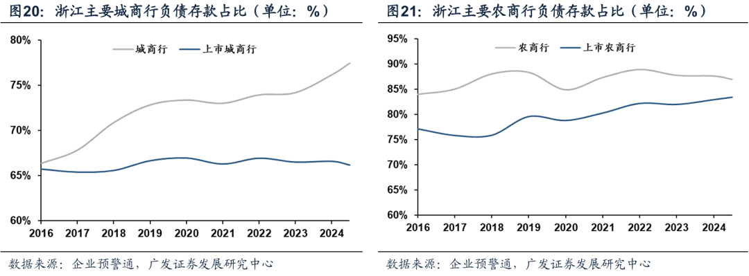 负债结构方面,25H1浙江地区城商行负债端客户存款占比为77.5%、高于上市城商行66.2%,农商行客户存款占比87.0%、高于上市农商行83.4%。2016年以来,浙江区域银行客户存款占比有所提升。