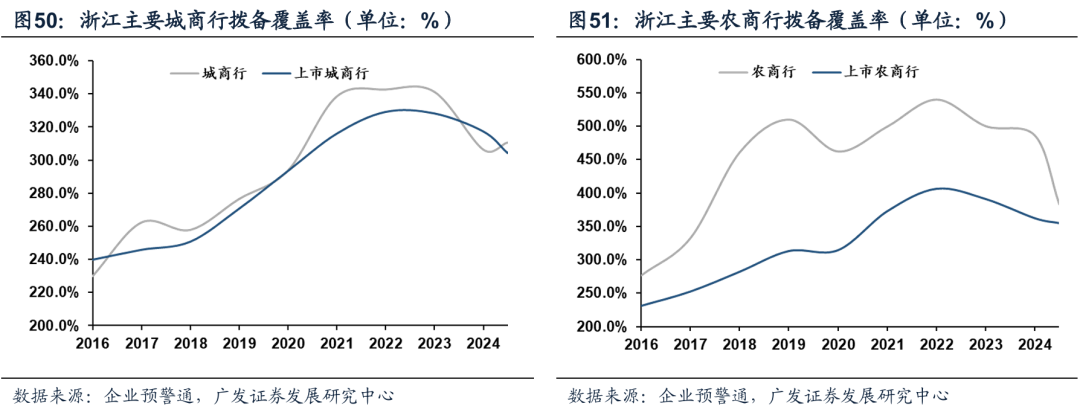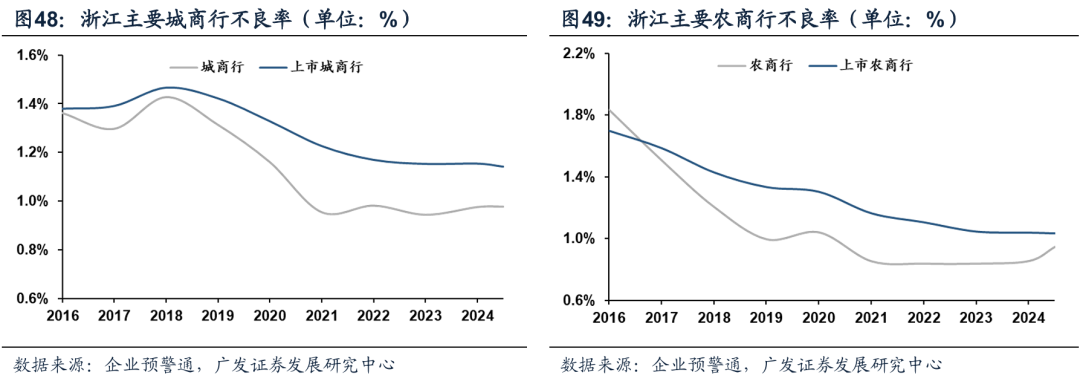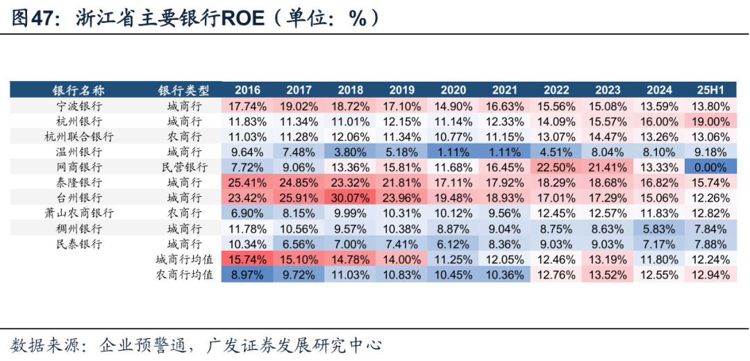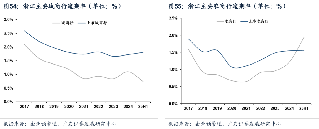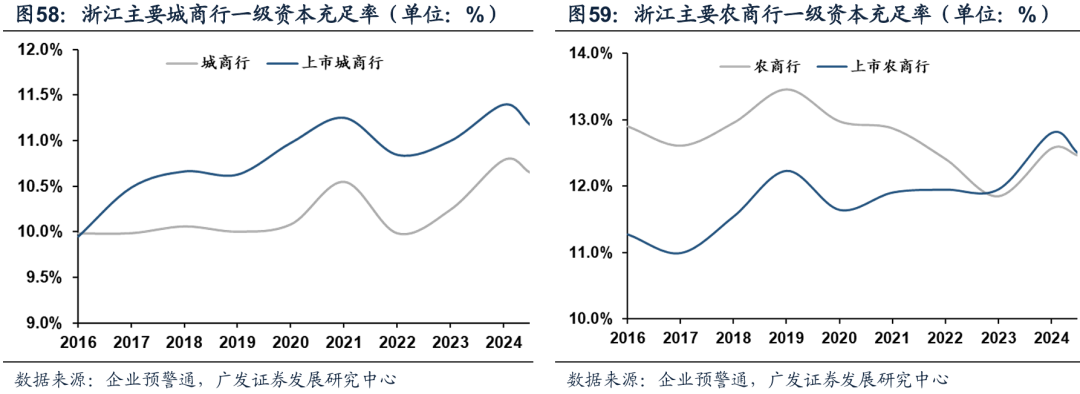 浙江省区域银行的资本充足率持平于上市行。25H1城商行的资本充足率/一级资本充足率平均为13.6%/10.7%,农商行分别为14.8%/12.5%,留有较高安全边际。