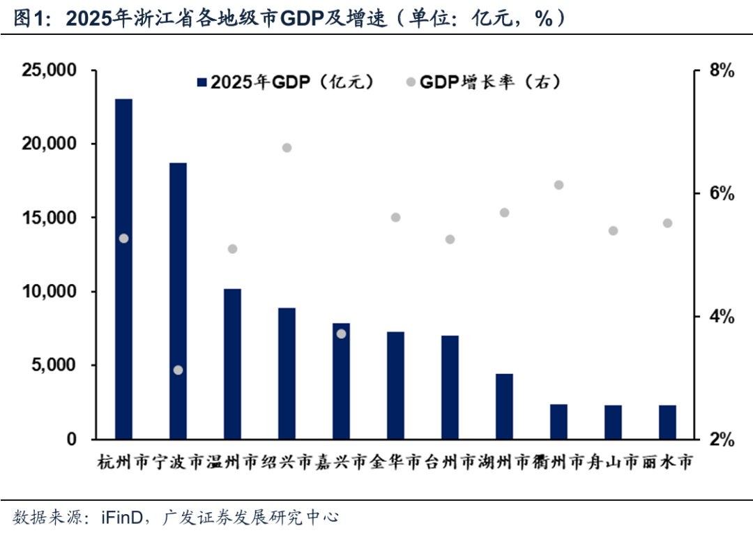 区域经济发展上,2025年杭州GDP占全省比重24.3%,其次为宁波、温州、绍兴,GDP分别为1.87万亿、1.02万亿、0.89万亿。从GDP增速来看,2025年绍兴市GDP增速最高,达6.7%,衢州市增速为6.1%,其余地市GDP增速在5%左右。