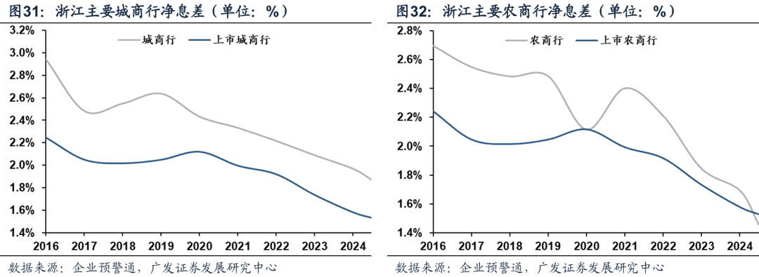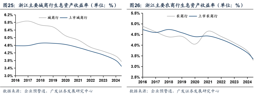 浙江省区域银行生息资产收益率持续下行,整体持平于上市行。对比上市行,2025H1浙江省城商行的生息资产收益率平均为3.7%,高于上市城商行的3.5%,农商行平均为3.2%,低于上市农商行平均水平3.3%。