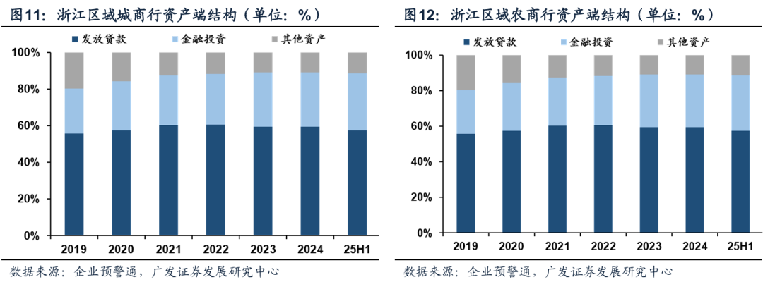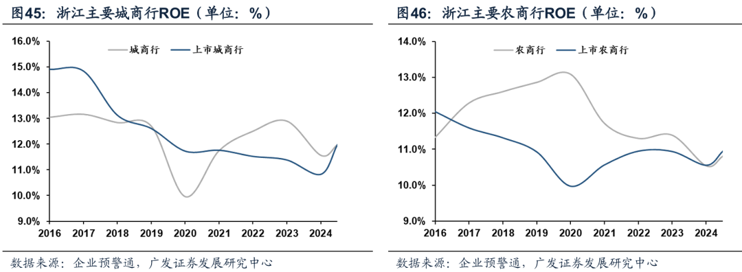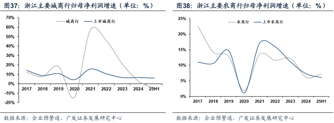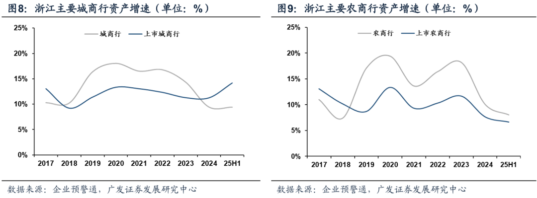 从资产增速来看,2019年以来,浙江省主要城商行及农商行的资产增速有所下滑。25H1主要城商行资产增速为9.4%、低于上市城商行资产增速14.2%,主要农商行资产增速8.0%、高于上市农商行资产增速6.7%。(注:区域主要银行为资产规模超1000亿元银行)。
