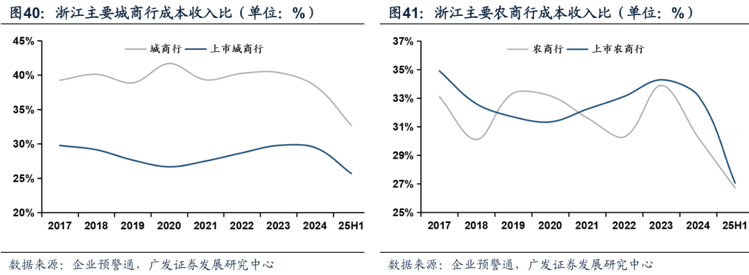 从成本收入比来看,25H1浙江省城商行成本收入比平均为32.68%,高于上市城商行的平均水平25.68%,农商平均为26.70%,低于上市农商行平均水平27.06%。