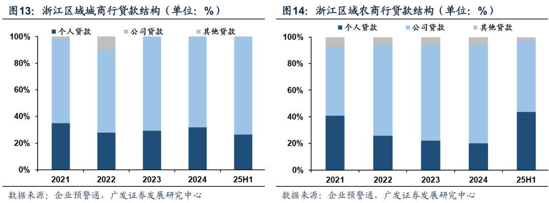 浙江区域银行贷款结构:以公司贷款为主,且公司贷款占比逐渐提升。25H1城农商行的公司贷款占比分别为72.4%、53.5%,高于个人贷款占比的26.5%、43.6%。