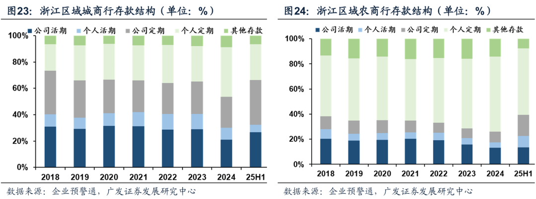 浙江区域银行存款结构:从活期存款结构来看,25H1城商行的公司和个人活期存款占总存款比重分别为26.7%、5.7%,农商行分别为13.6%、8.9%;从定期存款结构来看,城商行相对均衡,25H1分别占比33.8%、27.2%,农商行以个人定期为主,25H1公司和个人分别为16.8%、53.0%。