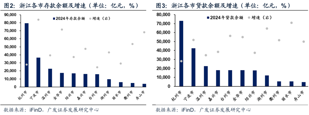 金融资源结构与增速方面,2024年浙江省存款与贷款金额分别为23.0万亿、23.8万亿,较上年同比增长4.0%、9.5%。分地市来看,杭州、宁波存贷款余额占全省比重较高,宁波、金华、舟山存款增速较高,台州、湖州、丽水等区域贷款增速较高。
