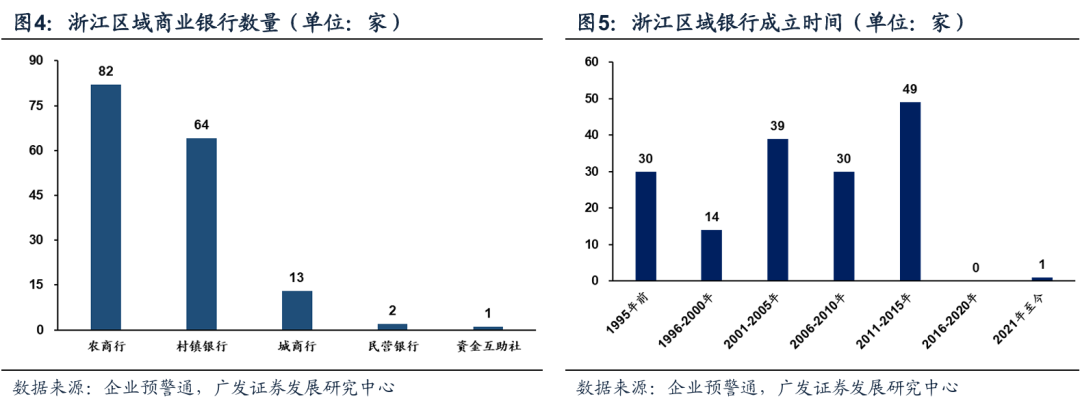 浙江省现阶段共有163家区域性商业银行。按银行类型划分,城商行13家,村镇银行64家,农商行83家,民营银行2家,资金互助社1家。按成立时间来划分,2006-2010年、2011-2015年分别有30家、49家商业银行成立。