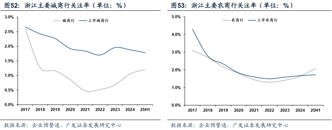 关注率:区域城商行低于上市行,区域农商行基本持平。25H1城商行的平均关注率为1.21%,低于上市城商行平均值1.78%。25H1农商行平均关注率为2.08%,高于上市农商行平均值1.72%。