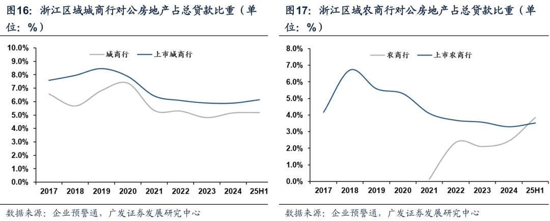 浙江区域银行对公房地产占总贷款比重:25H1城商行平均水平为5.19%,低于上市城商行平均值6.15%,农商行平均水平为3.86%,高于上市城商行平均值3.53%。