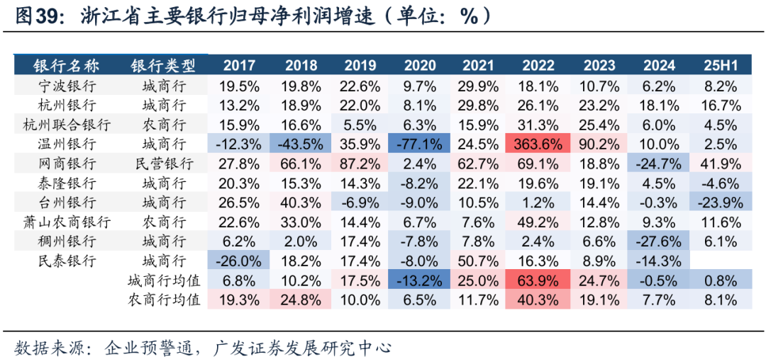 浙江省区域银行归母净利润增速下行,25H1浙江省城商行平均归母净利润增速为-4.70%,低于上市城商行的平均水平6.08%,农商行平均为7.26%,高于上市农商行平均水平6.03%。