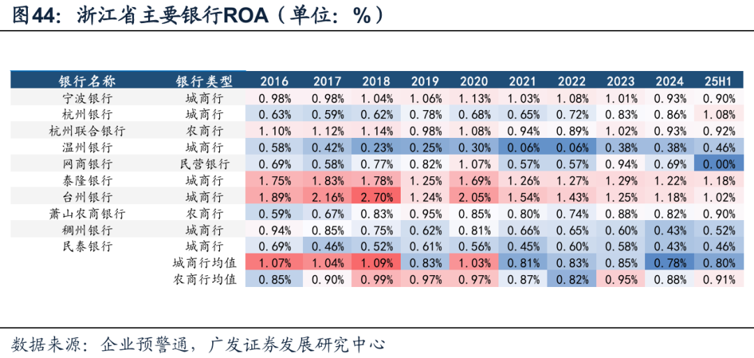 从ROA来看,25H1浙江省城商行ROA平均为0.78%、高于上市城商行平均值1bp,农商行平均为0.82%、低于上市农商行平均水平10bp。(ROA为年化数据,下同)