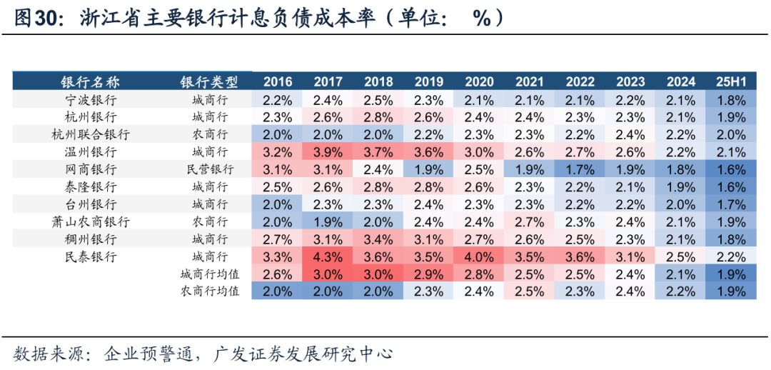 浙江省区域银行计息负债成本率持续下行,对比上市行,25H1浙江省城商行的计息负债成本率平均为1.9%,低于上市城商行,农商行平均为1.9%,高于上市农商行。