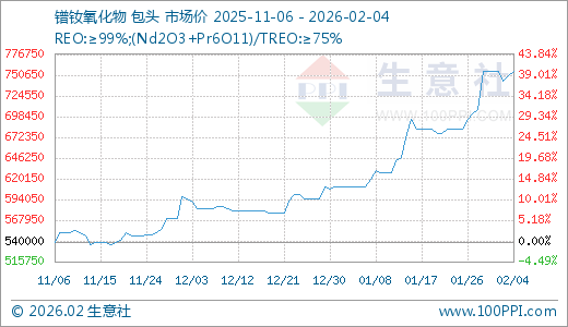 据生意社监测,镨钕氧化物02月04日最新价格755000.00元/吨,最近10天上涨10.62%,30天上涨23.77%,60天上涨29.61%。