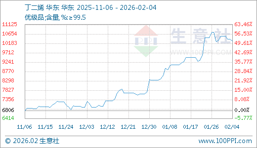 据生意社监测,丁二烯02月04日最新价格10300.00元/吨,最近15天上涨11.07%,30天上涨20.00%,60天上涨47.85%。