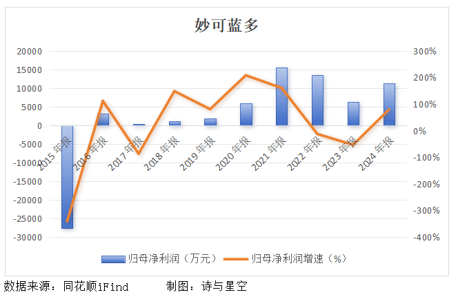 然而,现实却不尽人意。蒙牛入主后,妙可蓝多业绩增长乏力,其中营收增速2021年就开始下滑,2023年甚至出现负增长。2024年虽然回正,但营收仅跟2022年持平。