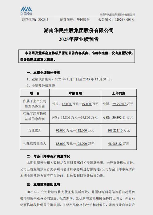 1月30日,华民股份(300345)发布2025年业绩预告。预计2025年实现营收92,000万元—112,000万元,上年同期103,221.10万元;预计扣除后营业收入88,000万元—108,000万元,上年同期98,988.32万元。