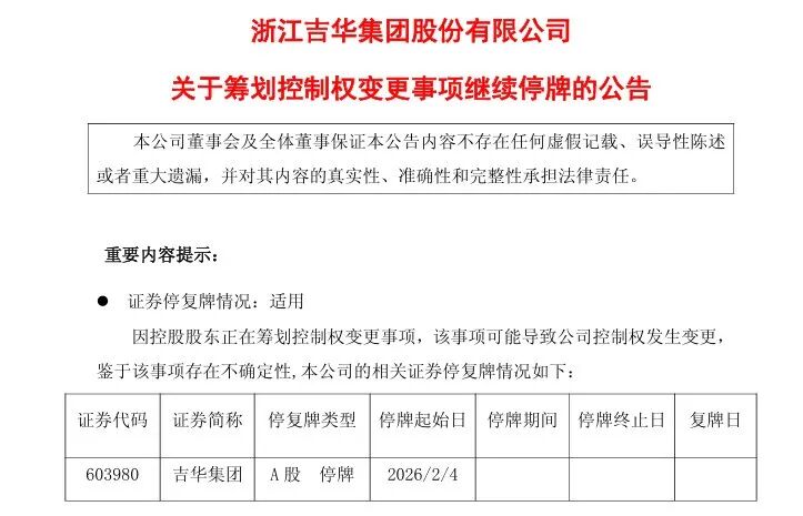 2026年2月4日,吉华集团(603980.SH)发布公告称,因控股股东杭州锦辉机电设备有限公司正在筹划控制权变更事项,公司股票自当日起继续停牌。这已是该股自1月30日以来的第二次停牌延期,显示交易已进入实质性磋商阶段。作为国内染料行业第三大企业,此次潜在的控制权变更或将重塑行业竞争格局。